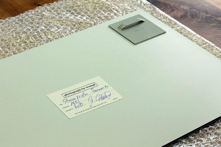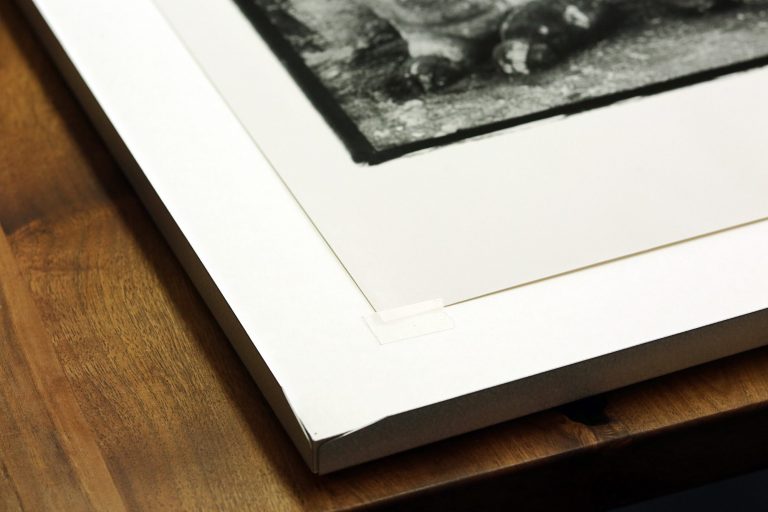 Unter dem Passepartout ist das Foto entweder mit Kaltkaschierfolie auf säurefreiem Karton aufgezogen ...