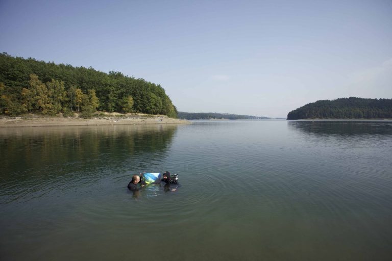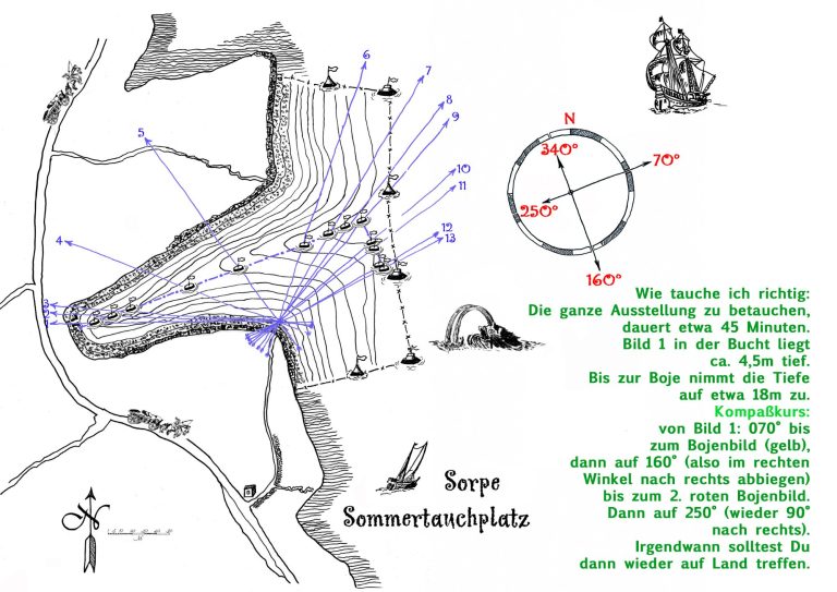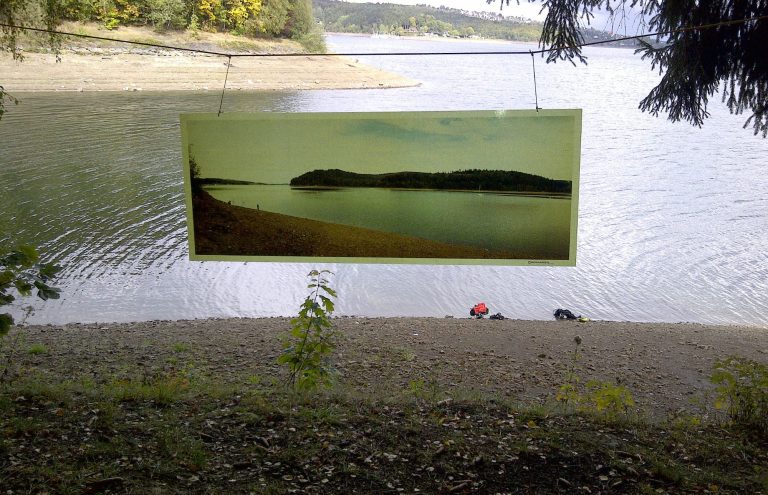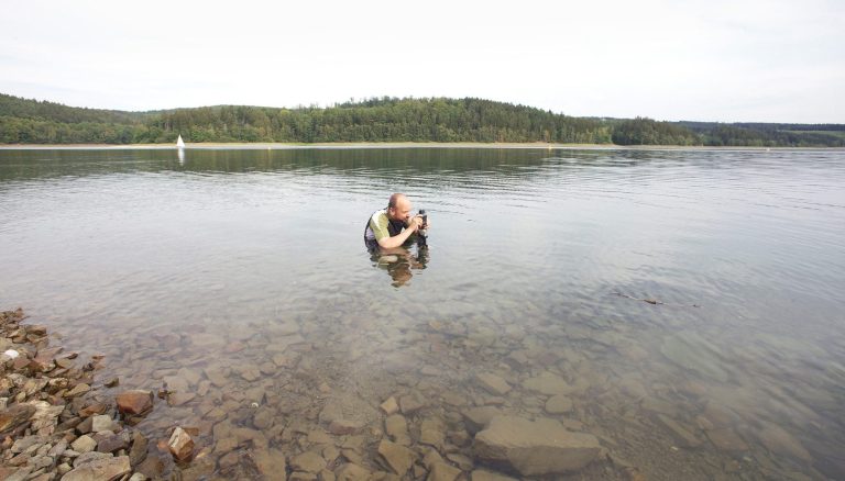 Der Sorpesee (NRW) ist ein Trinkwasserspeicher, vor allem für das Ruhrgebiet. Ein Bach (Sorpe) wurde aufgestaut, nun ist es ein See. Unterwasser ist es aber eigentlich nur eine überschwemmte Wiese. Zum Tauchen eigentlich öd. Meine Idee: ich fotografiere oberhalb der Wasseroberfläche und das sieht man dann in 10m Tauchtiefe.