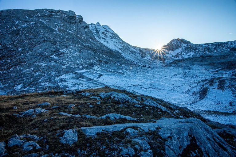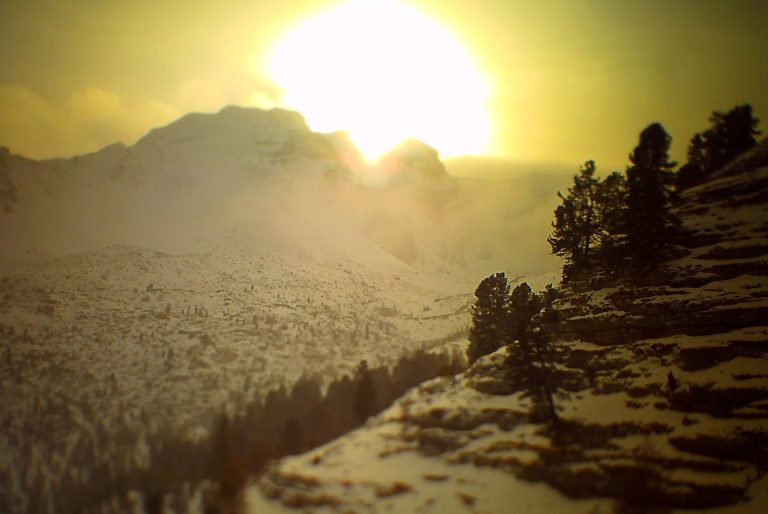 Sonne im Dunst hinter Lavarella, Dolomiten